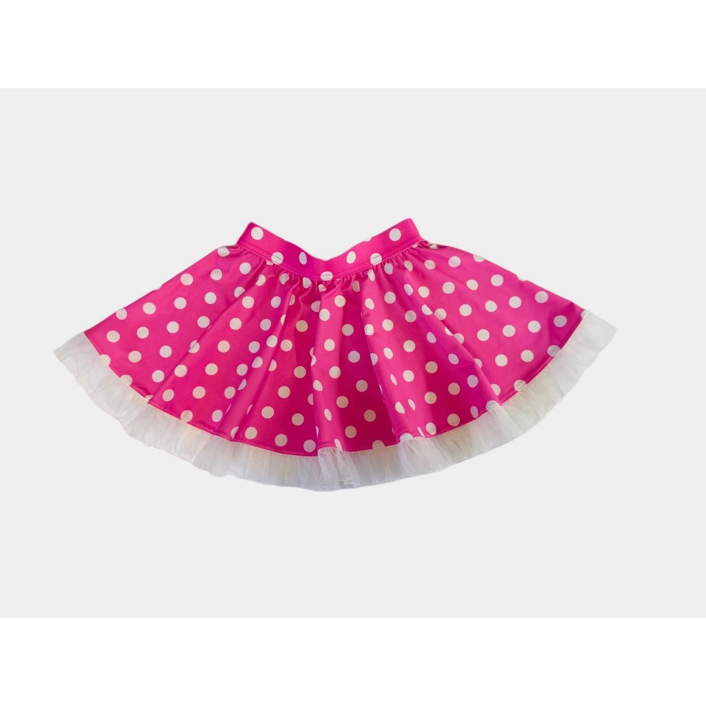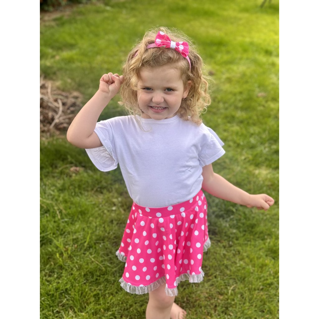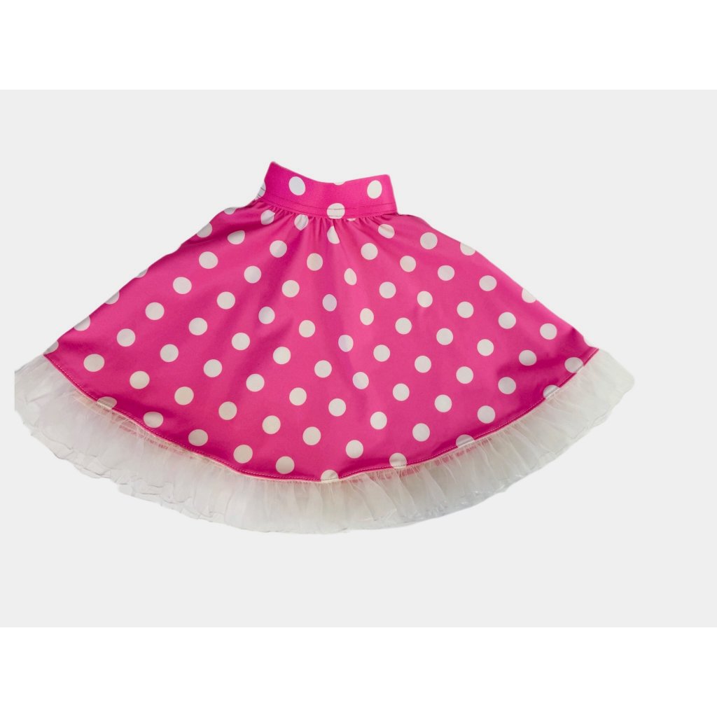 Kolová růžová sukně s bílými puntíky. Perfektně ladí ke zpívající panence Míši