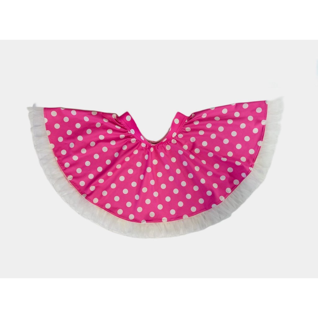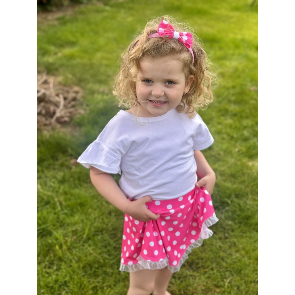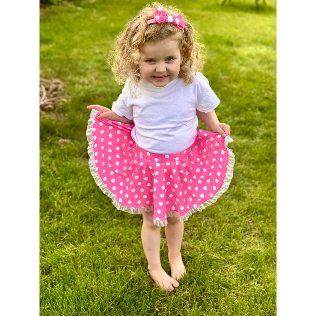 Kolová růžová sukně s bílými puntíky. Perfektně ladí ke zpívající panence Míši